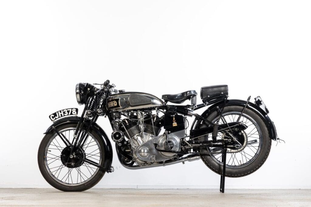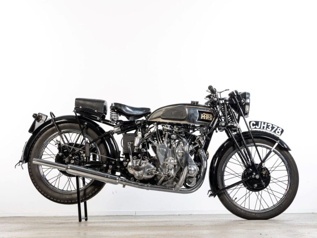 Another stellar entry for the auction is the 1936 Olympia Motorcycle Show factory display machine, 1936 Vincent-HRD 998cc Rapide Series-A (estimate £240,000 – 280,000). Whilst 100s of Brough Superior SS100s were built, a mere 78 Series-A Rapides were built before war broke out, making this an ultra-rare motorcycle. But not only is this one of the most collectable motorcycles extant, it is also the second example built and the oldest surviving complete example too. Exhibited on Stand 64, the machine caused a sensation – and was actually sold on the stand at Olympia, by Philip Vincent to its first owner, Pat Goffey, with the proviso that it first had to go to Kings of Oxford, to whom it was promised for promotional purposes. Following the Show, the bike was registered by Vincent on the 10th December 1936, before being sent to Kings in January 1937, going to Pat Goffey a short time later. The bike featured in a number of publicity photos during the period before World War II.