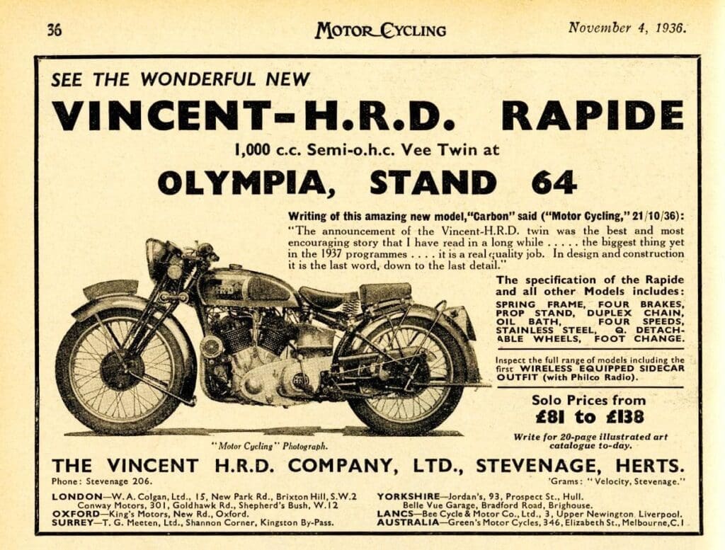 Following the war the Vincent passed through series of owners, all carefully recorded, before being purchased by the current owner in 1999. He undertook a painstakingly accurate restoration over an 18 year period. The task was finally completed in 2017 and that same year it was awarded ‘Best Machine of Technical Interest’ at the International Classic MotorCycle Show, Stafford, in April 2017. The machine has been kept in pride of place in the owner’s living room ever since. Seldom does the possibility arise of obtaining a Series-A Rapide. Even rarer still, is the opportunity to purchase one with such historical significance, having been the flagship machine for the company which produced arguably the most significant V-twins of the Twentieth Century. An oft-photographed publicity vehicle for one of the most iconic British motorcycle marques, its very existence interwoven with the fabric of the company, signalling the beginning of the Vincent mythology which still continues today. There can be few Vincent-HRDs which create so much excitement and interest among the true cognoscenti.